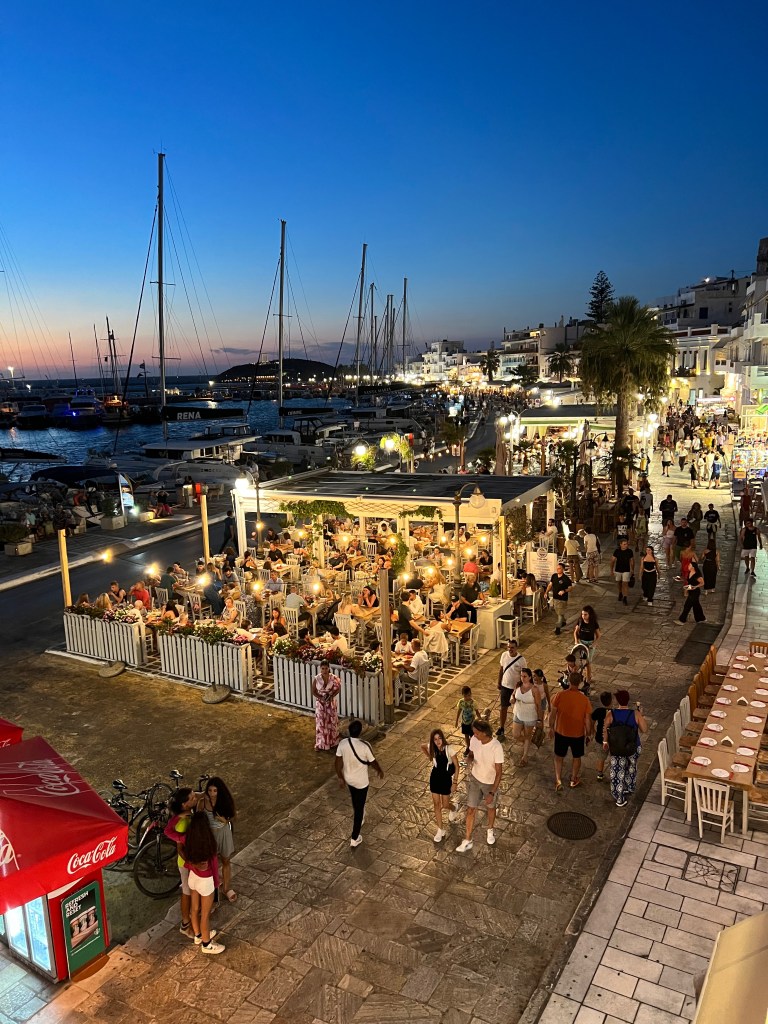That evening we headed into Chora for rooftop drinks at Flamingo Restaurant, where traditional Greek dancing and plate-smashing keep the energy high.